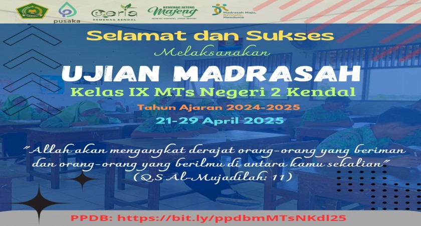 Kendal, 25 April 2025 – MTs Negeri 2 Kendal melaksanakan Ujian Madrasah (UM) tahun ajaran 2024/2025 yang dimulai sejak Senin (21/04) dan berakhir pada Selasa (29/04). Ujian madrasah telah memasuki hari kelima, Jum'at (25/04) sejak dimulai pada Senin lalu.