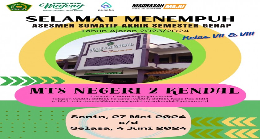 Asesmen Sumatif Akhir Semester Genap di MTsN 2 Kendal dilaksanakan mulai Senin, 27 Mei 2024 sampai dengan hariSelasa, 4 Juni 2024 mengunakan 18 ruang kelas yang diikuti oleh 501 peserta didik. Mata pelajaran yang di asesmen ada 17 mapel, adapun jadwalnya klik sini.
