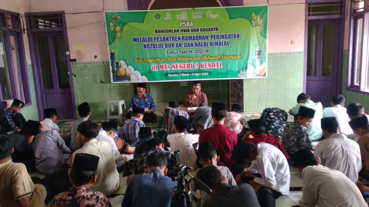 MTsN 2 Kendal mengadakan kegiatan pesantren ramadhan 1446 H yang dikolaborasikan dengan kegiatan P5RA dengan mengambil tema: Bangunlah Jiwa dan Raganya serta penerepan Tujuh (7) Pembiasaan Anak Hebat. Kegiatan ini dilaksanakan mulai awal Ramadhan dengan memberikan sosialisasi pada peserta didik diantaranya kegiatan kegiatan yang harus dilaksanakan oleh peserta didik, kemudian diisikan di buku kegiatan Pembiasaan Anak Hebat serta buku kegiatan Ramadhan. Yang semuanya itu dilaksanakan dirumah dalam belajar Mandiri. Kegiatan pesatren ramadhan dimulai tanggal 17 s/d 19 Maret 2025 dengan jadwal membaca asmaul Husna, Doa mau belajar, Ikrar, menyanyikan lagu Indonesia Raya, Tadarus Al qur’an, Sholat Dhuha, Kajian Kitab Kuing “ Mahadial Fiqyah”, Tanya jawab sekitar materi kitab, puasa dsb dan diakhiri dengan jamaah Sholat Dhuhur.